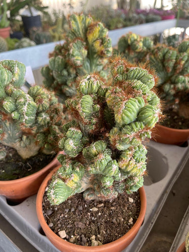 Questo esemplare è assolutamente unico! All’interno della stessa pianta le tipiche zone gialle dovute all’assenza in quei punti di clorofilla si sposano perfettamente con le caratteristiche asimmetriche della mostruosità, fino ad ottenere un cactus davvero particolare, che non sarà mai uguale ad altri e per questo è estremamente ricercato dai collezionisti! Il fusto verde è simile ad una scultura marmorea, molto compatto, con numerose costolature tubercolate ed asimmetriche. Presenta piccole areole lanuginose da cui fuoriescono spine fitte e sottili dal colore bruno-aranciato, sparse in modo non uniforme e davvero unico: è un esemplare che non può di certo mancare ai veri intenditori!